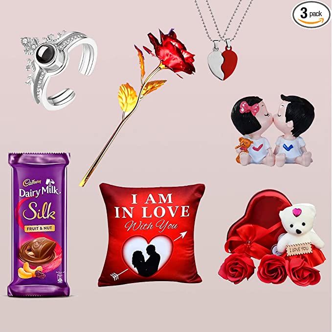 7 Days combo - Ring, Couple Heart Locket/pendent, Kissing Couple, Artificial rose, filler cushion, Chocolate, Heart Box with Rose & Love You Teddy