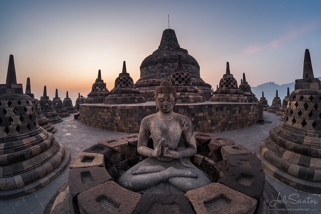 Borobudur Temple is a 9th-century Mahayana Buddhist temple located in Central Java, Indonesia. It is one of the largest and most impressive Buddhist monuments in the world and is a UNESCO World Heritage Site. It consists of nine stacked platforms, six square and three circulars, topped by a central dome.