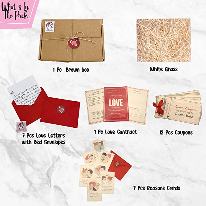 1 Pc Brown box, White Grass, 1 Pc Love Contract, 7 Pcs Love Letters, 7 Pcs Red Envelopes with 7 logo sticker, 7 Pcs Reasons Cards , 12 Pcs Coupons.